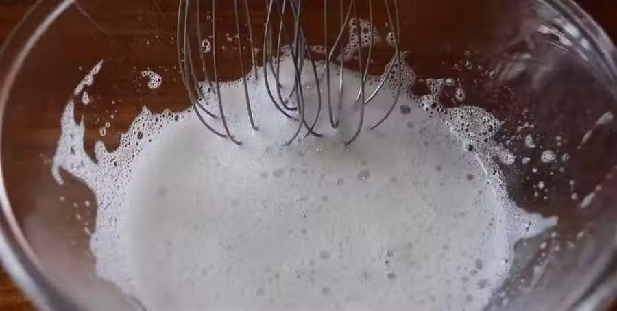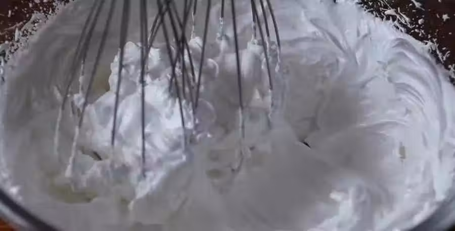把蛋白打至紋路不消退,有阻力,且拎起打蛋頭有小尖角即可。