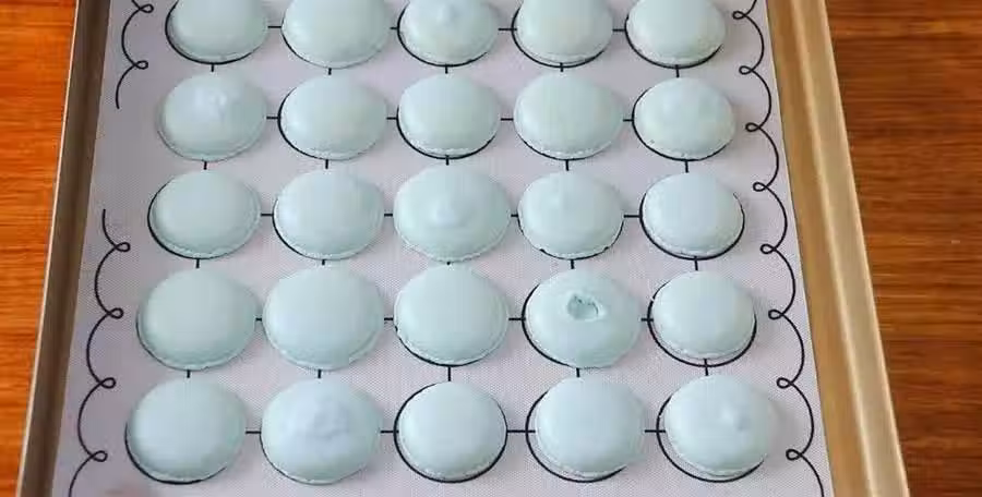 烤好以後取出烤盤,等它完全晾涼。取一片蛋白片,擠上自己喜歡吃的餡心,再覆蓋上一片蛋白片,這個馬卡龍就做好了,是不是挺簡單的?