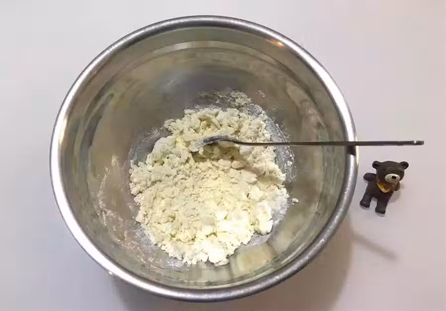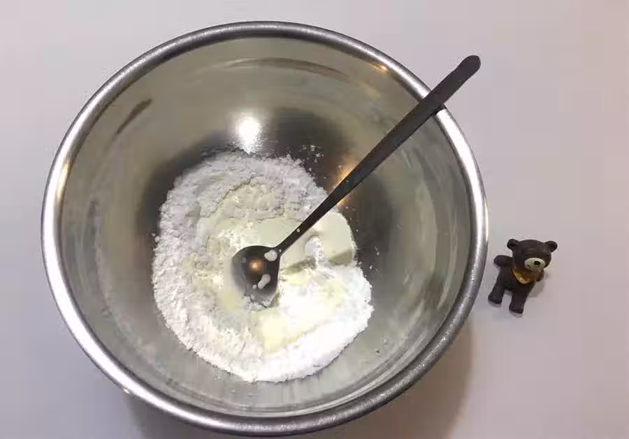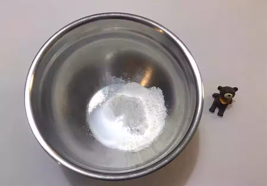 第一步:低筋麵粉、奶粉、細砂糖、食鹽和泡打粉請入料理盆,用勺子攪拌、大致拌勻。