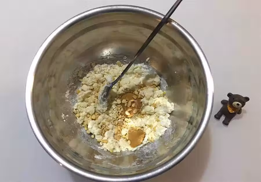 第三步:請入花生醬,倒入花生碎,戴食品級一次性手套,將食材大致抓勻,然後團成團就可以了。注意不需要追求揉勻揉光,過度揉面反而會影響口感。