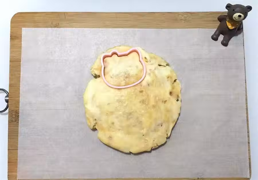 第五步:冷藏後的麵團取出,稍微回溫,然後按扁,擀開厚約1至1.5釐米,用模具刻出喜歡的形狀,有間隔地放在鋪了油紙的烤盤上。沒有模具或者圖省事可以直接像切披薩那樣切成6角。頂面可以刷蛋液也可以不刷,我比較喜歡不刷的清爽版。