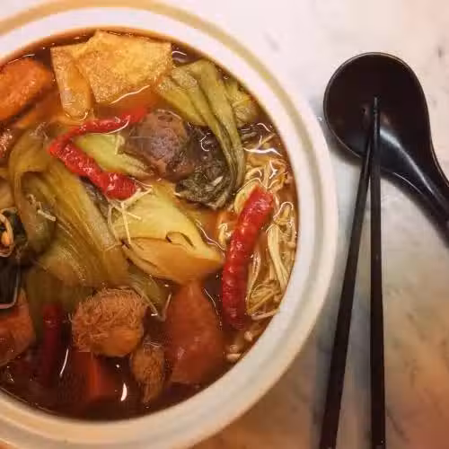 小技巧做法: 1)下半碗油暴香薑片和辣椒干。 2)加入香茅、紅蘿蔔、香菇、金菇肉和豆卜翻炒。 3)加入兩大碗清水、asam水和asam片和所有調味料,再加入芥菜,蓋上蓋子以中大火燜煮45分鐘至1小時左右,當中要注意水份蒸發,需適量加入。 4)最後加入豆皮、番茄、金針菇、鮑魚菇燜煮15-25分鐘即可。隔夜更好吃。