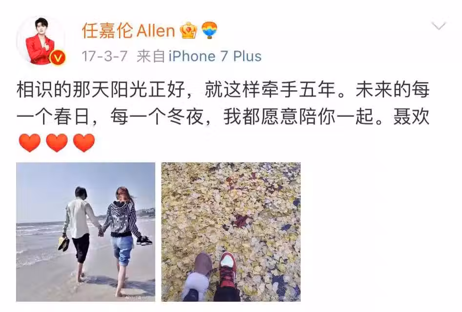 任嘉倫憑藉《大唐榮耀》邁入事業上升期,在2017年火速選擇公布戀情,無懼掉粉和人氣下降:「相識的那天陽光正好,就這樣牽手五年,未來的每一個春日、每一個冬夜,我都願意陪你一起,聶歡 」。隔年2018年2月大方公開已婚,且雙喜臨門迎來了家庭新成員,沒有想要透過販賣「單身人設」吸引更大一波流量。