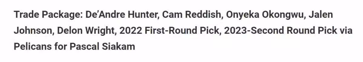 潛在交易方案:老鷹送出亨特+雷迪什+奧孔古+傑倫-詹森+賴特+2022年首輪簽+2023年次輪簽,從猛龍得到西亞卡姆。