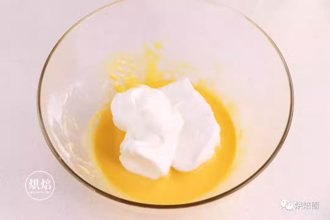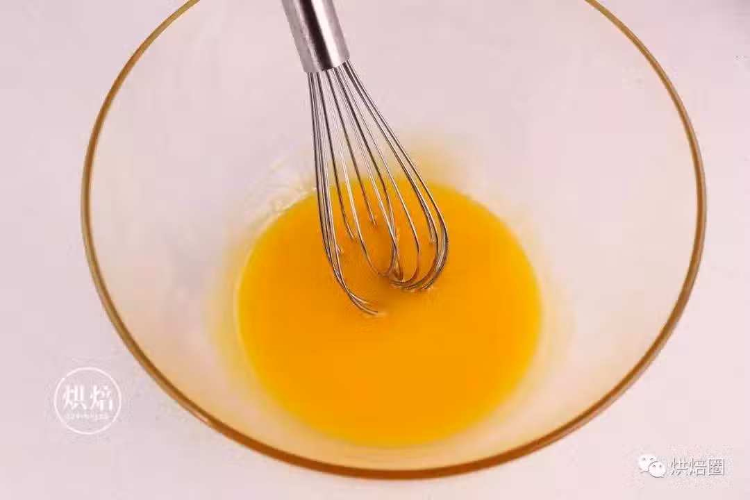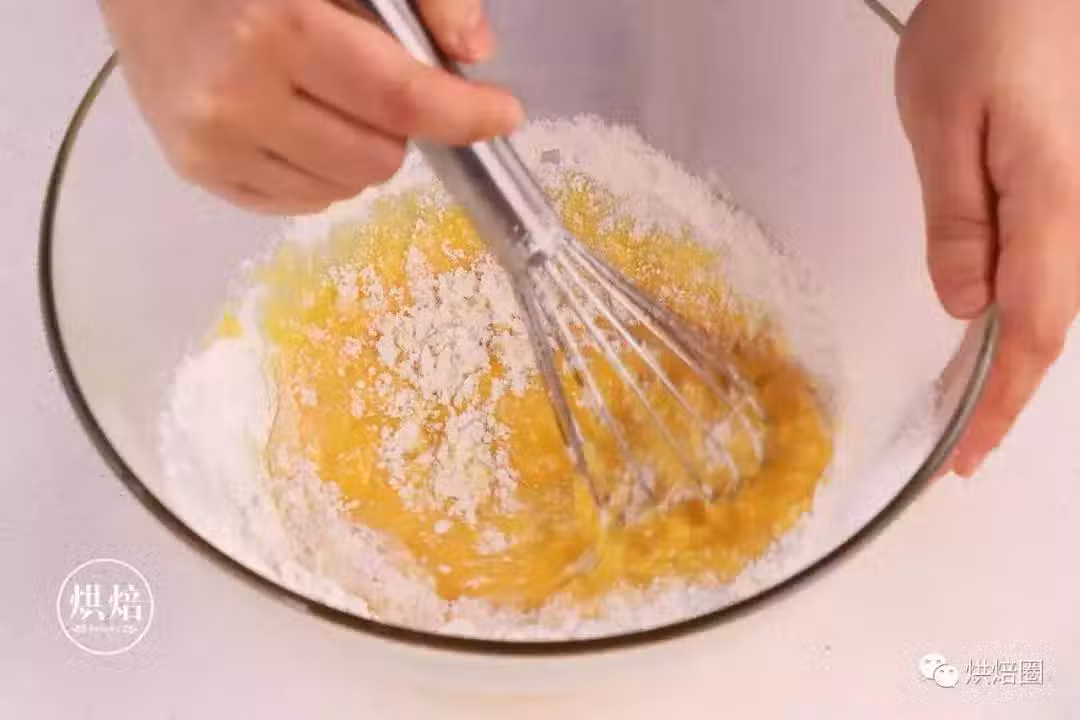 蛋黃中,加入玉米色拉油、牛奶、攪拌均勻,充分乳化。