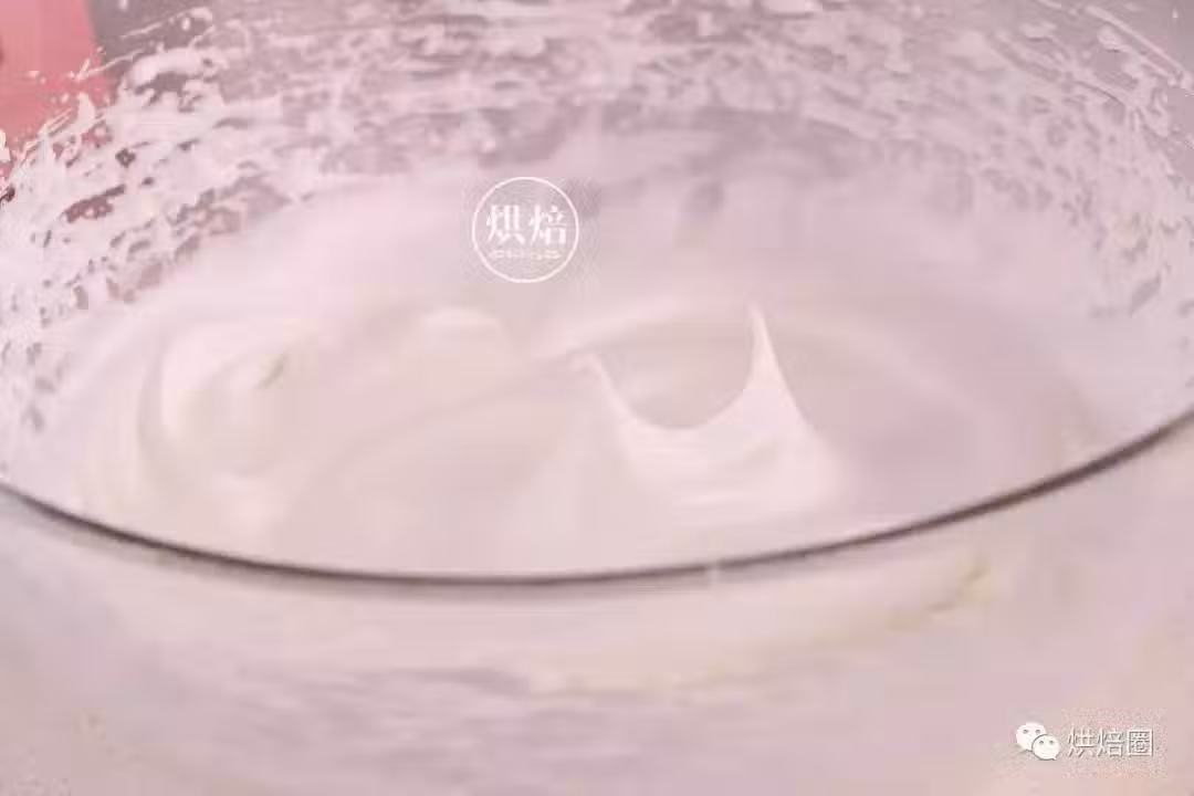 蛋白分三次加入細砂糖,開啟電動打蛋器,打發至拉起打蛋頭出現大彎勾的濕性發泡狀態。