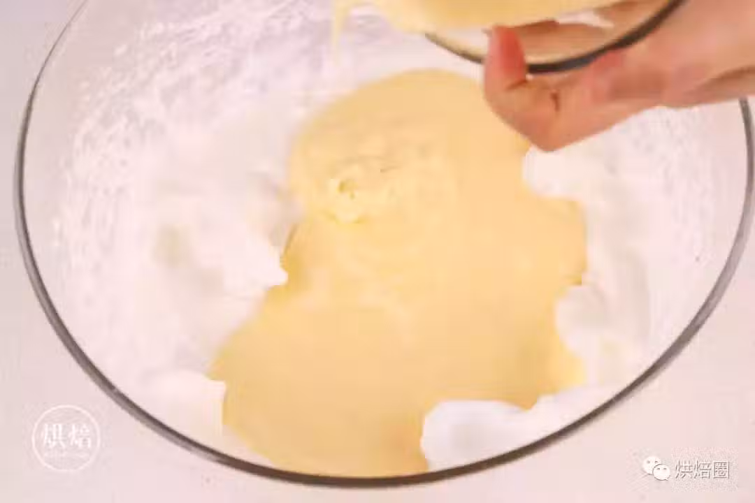 取三分之一蛋白霜加入咖啡蛋黃糊中,翻拌均勻後,倒入剩下的蛋白霜中,翻拌均勻。