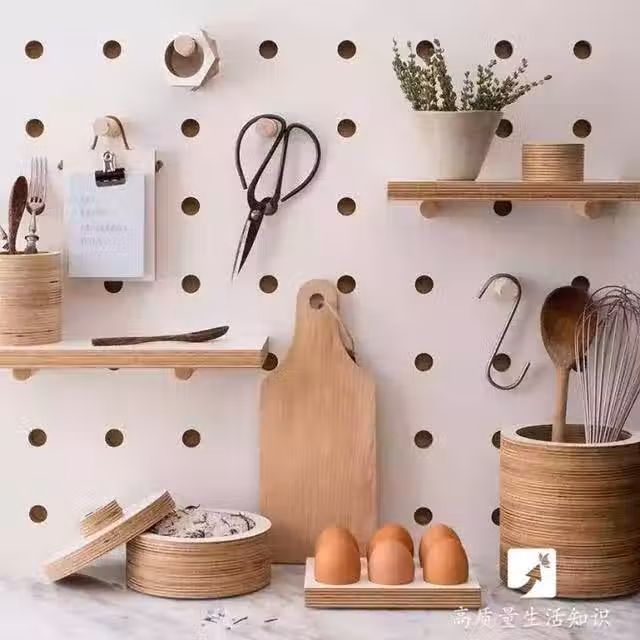 很多人已經把洞洞板運用到了自己家裡,長短隨意的橫桿,加上木板的設計,是廚房裡實用又好看的收納小能手。