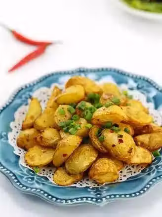 2. 鍋里放入適量的油加熱,放入土豆炸至金黃色,撈出來控油,將炸好的土豆撒上辣椒粉,孜然粉,椒鹽粉攪撈均勻即可完成。