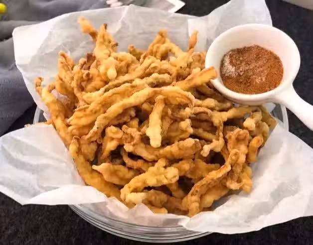 2. 腌好的杏鮑菇擠干水分,放入麵糊中攪拌均勻,確保每一條都裹上面糊。