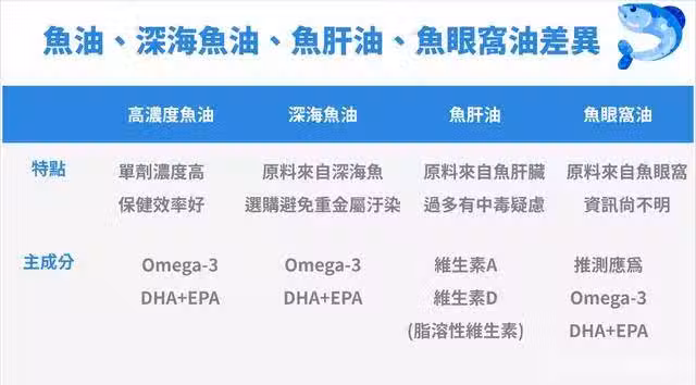 高濃度魚油特點是什麼?高濃度魚油只要少量幾顆,就可以幫助你攝取到足量的Omega-3,同時高濃度魚油可以避免攝取到過多額外的脂肪和添加物。深海魚油特點是什麼?深海魚油則主打原料取自深海魚種,但由於近年來海洋污染嚴重,深海大型魚種容易體內堆積重金屬,因此挑選時,也可以留意魚油來源是否取自純凈海域、小型魚種。魚肝油特點是什麼? (使用需謹慎!)魚肝油和魚油只差一個字,但卻與魚油主成分DHA、EPA不同。 魚肝油取自鱈屬魚類的肝臟,主成分是維生素A和維生素D,對於預防夜盲症、維持骨骼發育、促進鈣吸收很有幫助。 不過由於魚肝油屬於脂溶性維生素,所以不宜攝取過多,以免體內累積過量。魚眼窩油特點是什麼?之前有人問我魚眼窩油和魚油有什麼差異?老實說我是第一次聽魚眼窩油,我搜尋了一下國內外的資料,並沒有找到太多關於魚眼窩油的資訊,所以推測可能是魚油廠商的「噱頭」,實際上成分應該還是以Omega-3為主。有相關專業知識的,可以在評論區指教。 二、魚油好處有哪些?魚油有哪些人不能吃嗎? 很多人或許知道魚油,都是因為它含有的DHA這種適量攝入後「會變聰明」的化合物。 不過因為很多人並不能經常吃到海魚,所以退而求其次選擇魚油。 後來在網上,電視台中,商家都會大力宣傳常吃魚油可以幫助心血管健康、有助於腦部記憶力......,事實真是如此嗎?