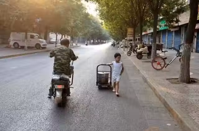 孩子才6歲,每天太陽剛剛升起的時候她就出現在了街頭,獨自拉著一小推車的米粥趕到2裡地外媽媽開的小吃部那裡去,趕在早起的人們起來前,準備好早餐的粥,而這個時候媽媽正在菜市場購買做食物的蔬菜......