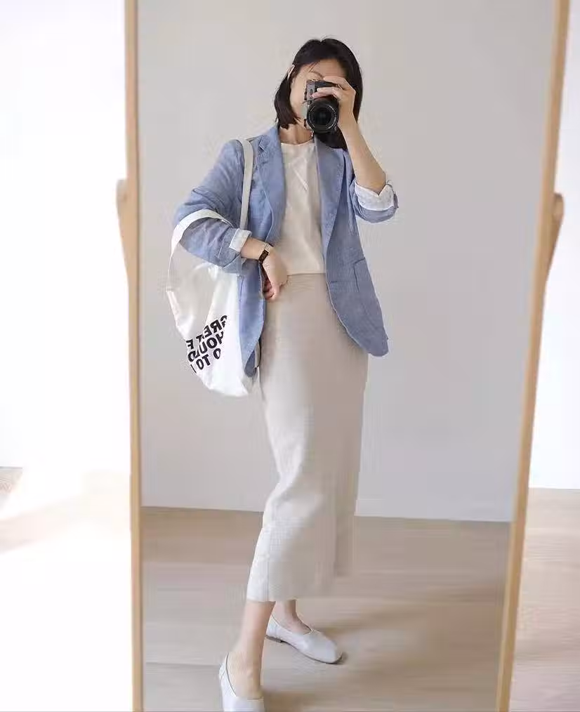 西裝是職場女性的必備,但中規中矩的穿搭毫無特色,反顯呆板,所以不防試試輕職場穿搭: 一正式、一休閒,或一成熟、一優雅。比如這一身,藍色西裝不管是顏色還是版型是,都過於刻板,在搭配上就選擇比較休閒T恤或優雅的裙裝,相互映襯,更添姿色。