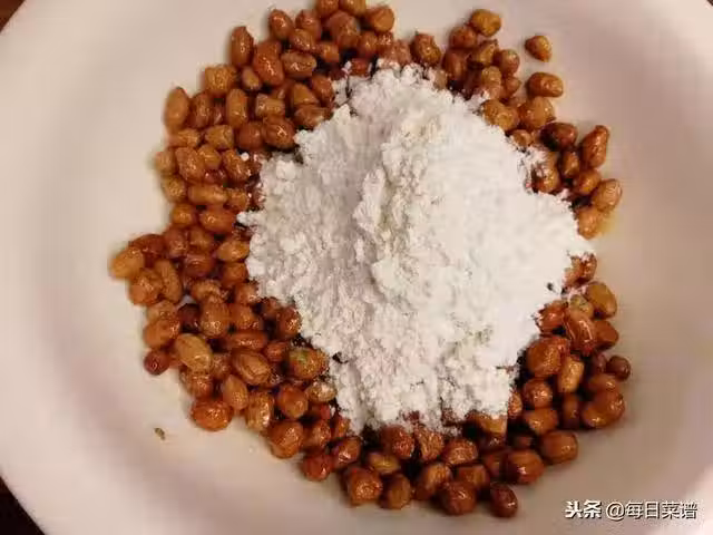 4、讓每粒花生米都均勻的裹上麵粉,一個一個不要粘連在一起最好,有很多朋友喜歡放澱粉炸花生米,個人建議還是用麵粉好一些。