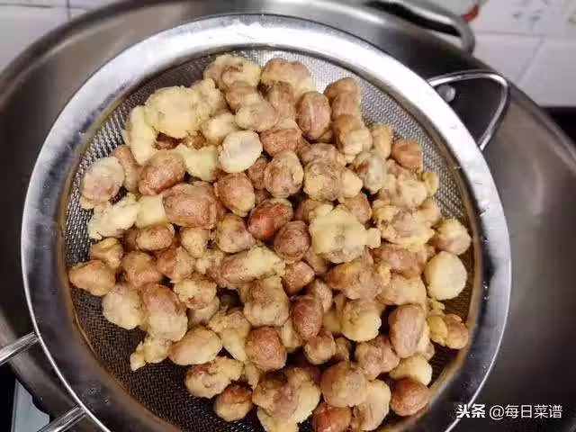 5、熱鍋倒入油,油溫4成熱,用漏勺漏去多餘的麵粉,把裹好的花生倒入鍋內。