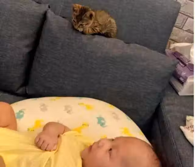 但事實證明,爸媽的考慮是非常多餘的,因為小貓和寶寶都似乎感受到彼此的存在,對各自都無比的溫柔。