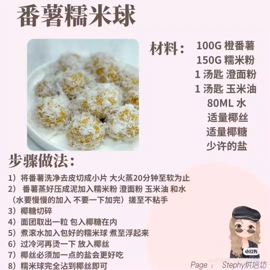 1)將番薯洗凈去皮切成小片 大火蒸20分鐘至軟為止 2) 番薯蒸好壓成泥加入糯米粉 澄麵粉 玉米油和水 (水要慢慢的加入不要一下加完)搓至不粘手