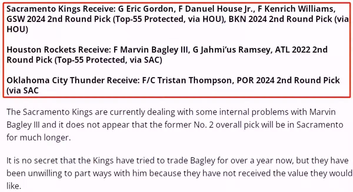 具體的內容是,火箭隊送出戈登、豪斯、兩個2024年第二輪選秀權,從而得到巴格利、拉姆齊、國王隊提供的2022年次輪選秀權,國王隊送出巴格利、拉姆齊、TT-湯普森、2022年次輪選秀權以及2024年次輪選秀權,從而得到戈登、豪斯、肯里奇-威廉士、火箭隊提供的兩個2024年第二輪選秀權,雷霆隊送出肯里奇-威廉士、換了TT-湯普森和國王隊提供的2024年次輪選秀權,可以說這筆交易方案對於三支球隊各有所需。