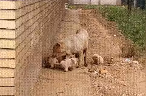 一條快要廢棄的小巷裡,一隻消瘦的流浪狗頹靡地趴在地上,時而茫然地看向柵欄外的街道,時而低頭緊緊地蜷縮著身子,因為……4隻小狗正在牠的身旁。