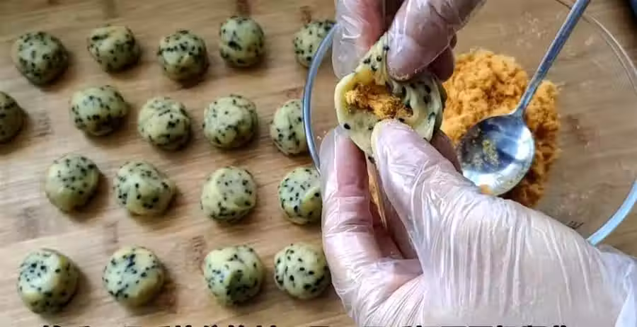 準備適量的肉鬆粉。然後把麻薯團分成20份,全部搓圓。再包上肉鬆餡。間隔開距離放烤盤。