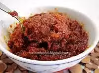 4)把晾乾的辣椒干放到攪拌機里,加入一些水分攪拌,直到所有辣椒干磨成泥狀,備用(水分不宜過量,因為最後還得耗時將叄巴煮至收干水分)。