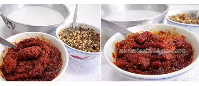 - 二姐告訴我,她煮1kg和500g辣椒乾的分別。她說其它的材料都減半,只有香茅和Buah Keras保持不變,但是叄巴的美味卻難分軒輊。這下可難倒我了。我想說只煮1/4的量(上述紅色字體的部分),但是香茅和Buah Keras保持不變的話會不會太多了?所以我又「自作聰明」,將香茅和Buah Keras的分量只是減半而已。可是最終結果卻是我用完家裡所有的辣椒干(300g)、香茅(260g)和Buah Keras(30g)。出來的叄巴還真的不是蓋的。