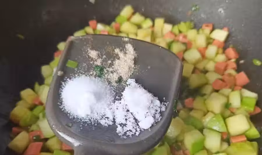 6、根據個人的口味,加入半勺鹽、半勺白糖、適量胡椒粉,翻拌均勻。