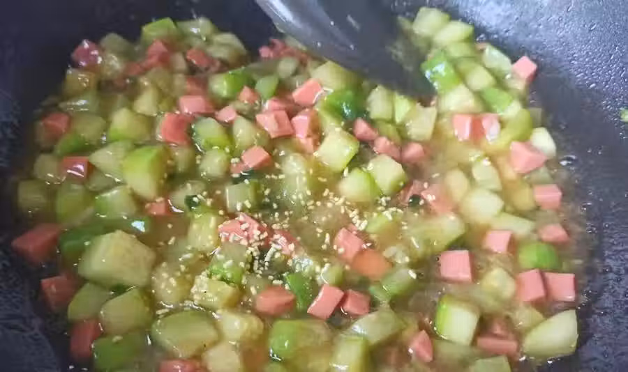 5、再將西葫蘆和火腿丁倒入,繼續翻炒,約1分鐘左右,將西葫蘆炒至7成熟。