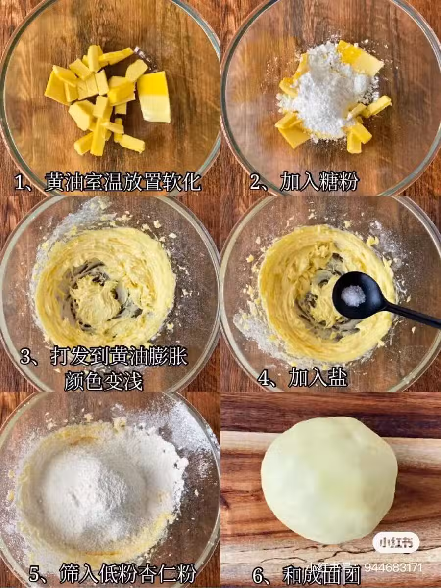 準備低筋麵粉70g、黃油60g、糖粉40g、鹽0.5g、杏仁粉60g。