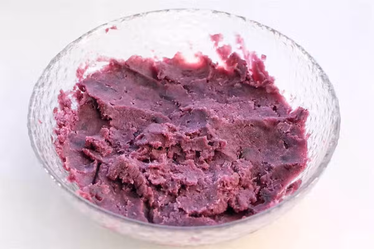 2.取出蒸好的紫薯放進容器中,用勺子碾壓成細膩的紫薯泥。