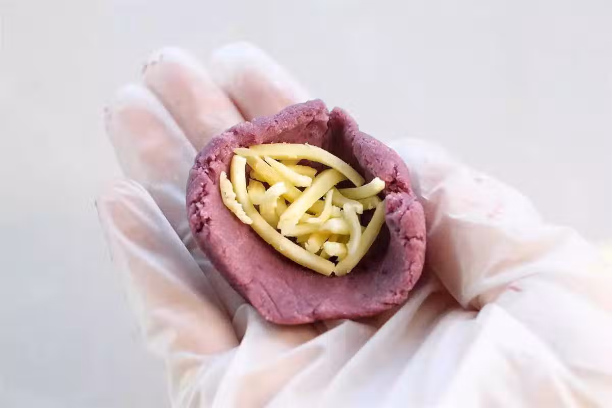 5.收口封嚴把芝士碎包裹起來,用雙手揉搓成光滑的紫薯球。