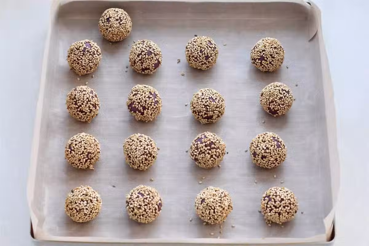 紫薯泥的含水量不同,如果麵團太幹可以適量加水,反之就加糯米粉來進行調節。烤制時間和溫度會根據紫薯球的大小而變化。 也可以採用油炸的方式,但是熱量會比較高。