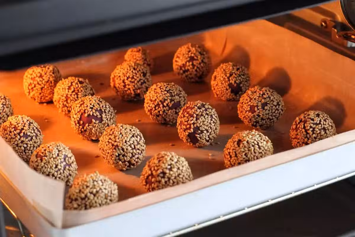 10.待表面芝麻微微變色即可出爐,趁熱食用還有超長拉絲喲!