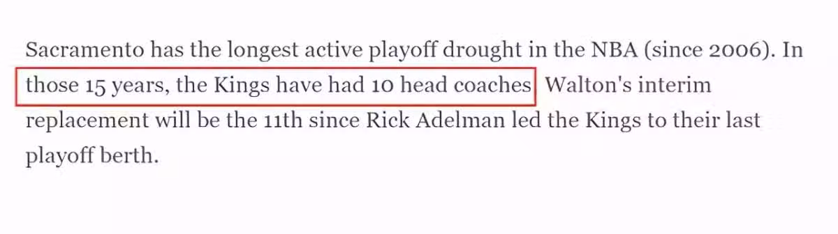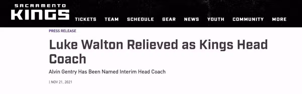 國王總經理蒙特-麥克奈爾說:「經過對賽季至今的全面評估後,我決定對主教練的職位進行調整,我要感謝盧克(沃頓)對我們球隊做出的努力和貢獻。」過去8場比賽,國王輸了7場,本賽季迄今為止的戰績是6勝11負,排名西部第12位。最近幾場失利,他們的對手都是排名靠後的球隊,比如馬刺、雷霆和森林狼。這讓國王高層很不滿。上一場比賽,國王主場球迷出現醉酒嘔吐事件,也有人調侃沃頓的執教表現讓球迷都看吐了。