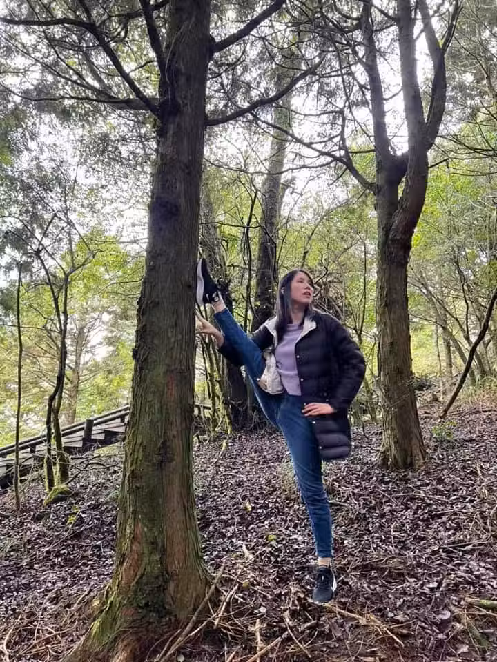 一邊享受大自然的餽贈,她也忍不住讚嘆女兒的乖巧懂事,一路上搭車、爬山、早起都淡定配合,馬上就獲得眾人讚賞!一家人留下許多美照,余苑綺的氣色也明顯紅潤,到了郊外放鬆心情的她,整個人顯得很愜意,不只對鏡頭露出開心微笑,還可以穿著牛仔褲輕鬆踏在樹上,劈腿一字馬毫不費力,盡情展現大長腿,柔軟度相當驚人。
