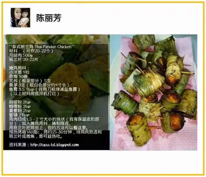 泰式班蘭雞 Thai style Pandan Chicken 材料: 無骨雞腿肉 500g(保留雞皮) 班蘭葉 30~35片(洗凈,備用)-