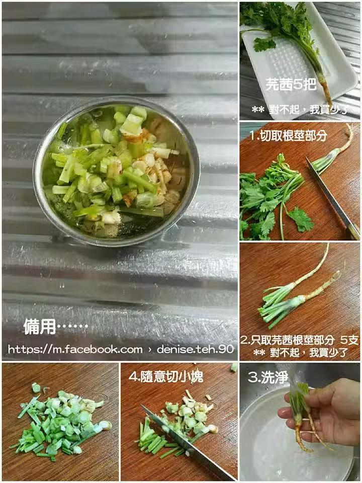 廣告-請繼續往下閱讀 蒜瓣 10瓣(去衣,洗凈,切碎) 芫茜 5把(切耶根莖部分,洗凈,切碎 ) 香茅 3支(取白色部分約4寸長,洗凈,切碎 )