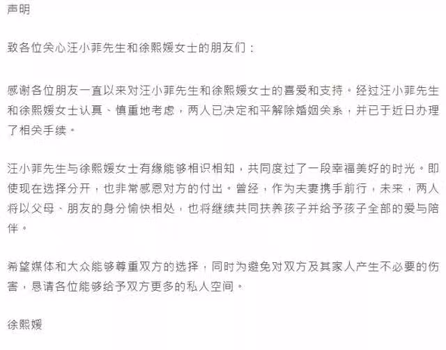 11月22日,台媒報道稱大S已在月初到法院起訴離婚,與汪小菲的十年婚姻正式告吹。 至22日中午,大S透過律師發布離婚聲明,稱兩人已經和平解除婚約,共同撫養一雙子女:「未來,兩人將以父母、朋友的身分愉快相處,也將繼續共同扶養孩子並給予孩子全部的愛與陪伴。 希望媒體和大眾能夠尊重雙方的選擇,同時為避免對雙方及其家人產生不必要的傷害,懇請各位能夠給予雙方更多的私人空間。」