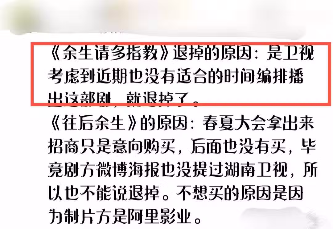 不過其後又有網友爆料,其實並不是芒果台想要把這部劇退掉,而是因為《餘生》與芒果台簽的播出合約已經到期了,據悉當時《餘生》是與芒果台簽訂了兩年的合約,而原定的到期日子是今年的11月20號,但這兩年期間因為各種原因都沒有播出。