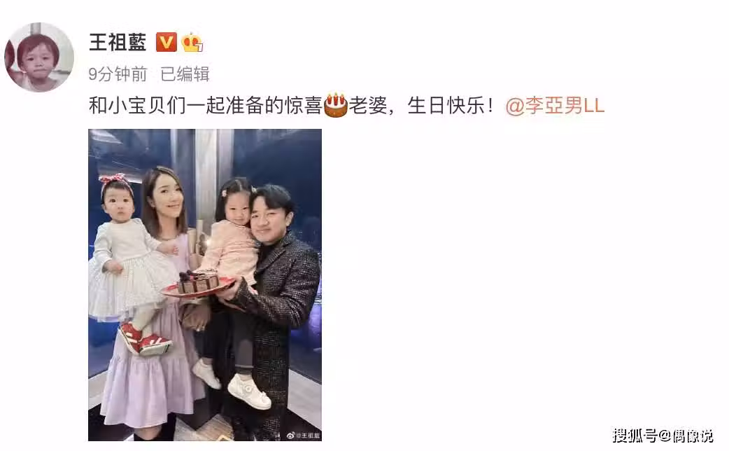 11月26日,王祖藍發文為老婆慶生,透露和小寶貝們一起準備了驚喜,並曬出一家四口的全家福,畫面溫馨。