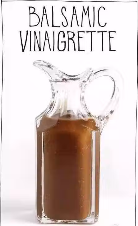食材:橄欖油100ml、義大利香醋50ml、第戎芥末醬15ml、龍舌蘭糖漿15ml、大蒜粉少量、鹽少量、胡椒粉少量