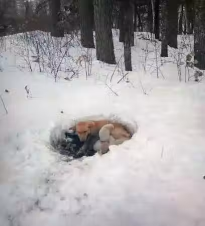 後來狗狗們被人們發現了,當大家趕過來的時候發現,狗媽媽吧所有的孩子們都藏在了身下,用自己的身體給孩子們取暖,即使牠自己已經快凍僵了。