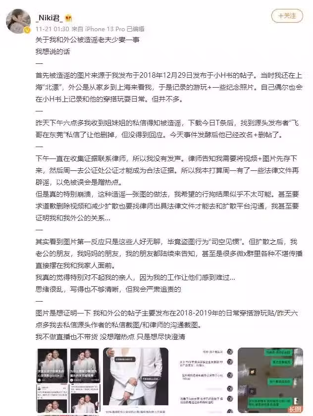 11月21日中午,博主又發文表示:關於被造謠,一定剛到底。