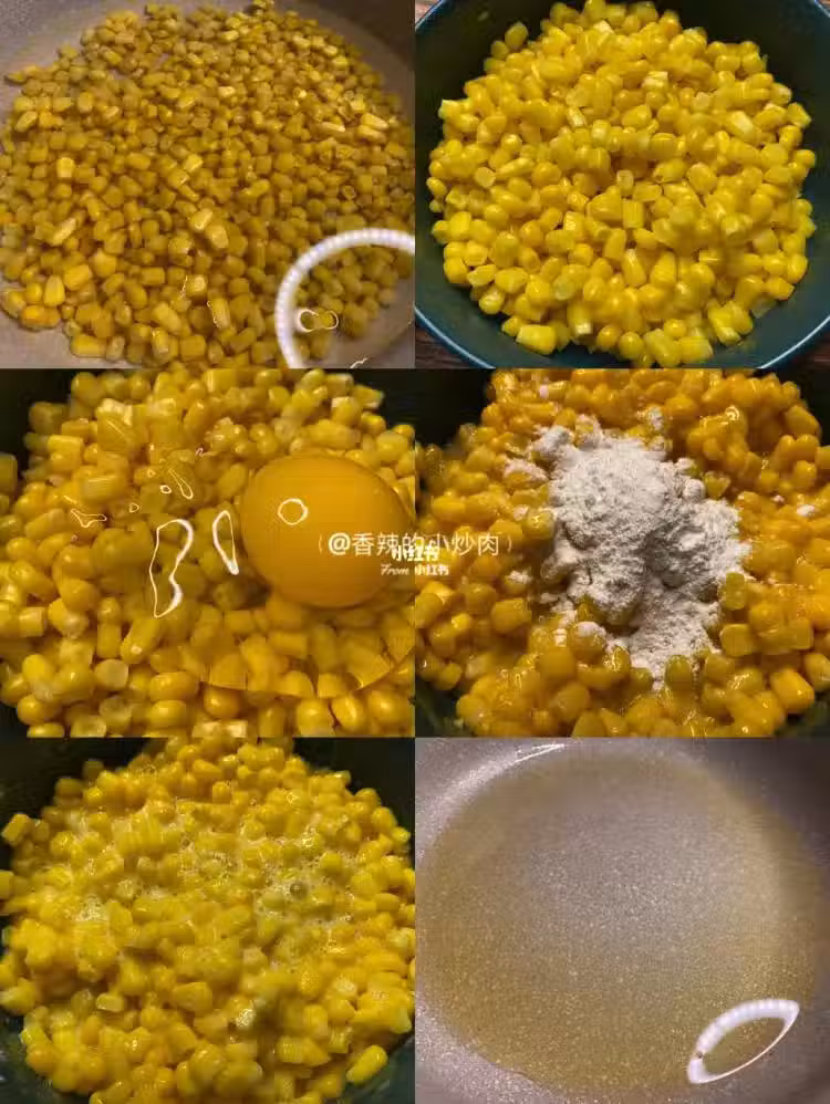 食材:芝士碎50克、甜玉米粒150克、鹽1克、雞蛋1個、玉米澱粉50g。