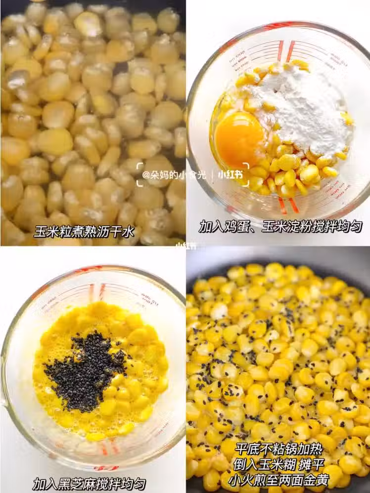 食材:玉米粒150克、雞蛋1個、玉米澱粉10克、黑芝麻少許。