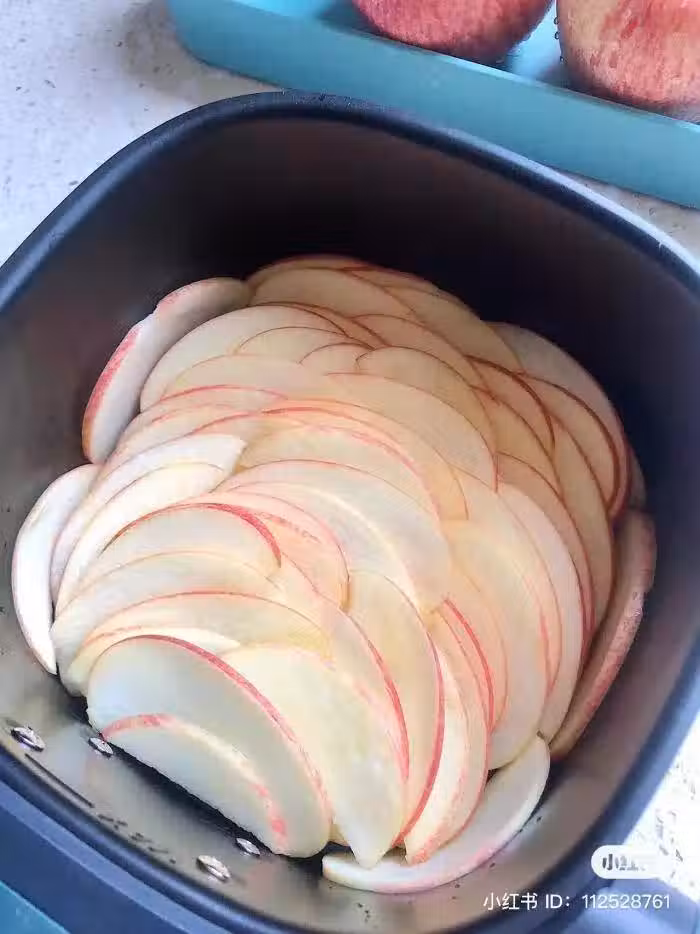 3. 瀝干水後,把蘋果片放入氣炸鍋,可調成110度30分鐘或120度20分鐘,不同品牌的空氣炸鍋溫度可能有些差異,可自行調節時間。