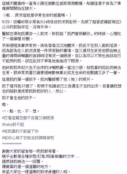 貼文分享後,讓很多人都很不捨,直呼:「妳做了對自己好的決定,過得好就好,孩子不會太苛責妳的!」、「雖然說孩子沒有錯,但是在這樣的環境長大,其實也會很辛苦!」不過也有網友不以為然,認為她應該生下孩子:「妳之後會後悔,孩子可能會給妳很多回憶的!」、「應該生下來才是,幾年後回想,就會覺得後悔!」
