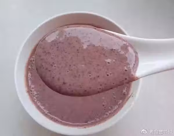 3、將煮好的黑米飯放在料理機,加入大棗丁和熱豆奶打成糊,即可享用,喜歡甜的可以再加入紅糖或冰糖。