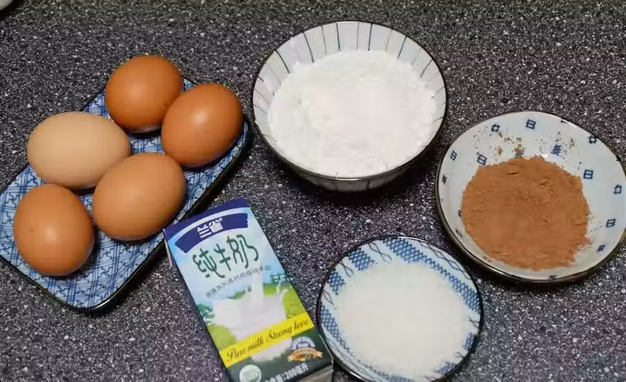 【配料表】:雞蛋5個、白砂糖45g、純牛奶100g、低筋麵粉110g、可可粉10g、開水約20g;
