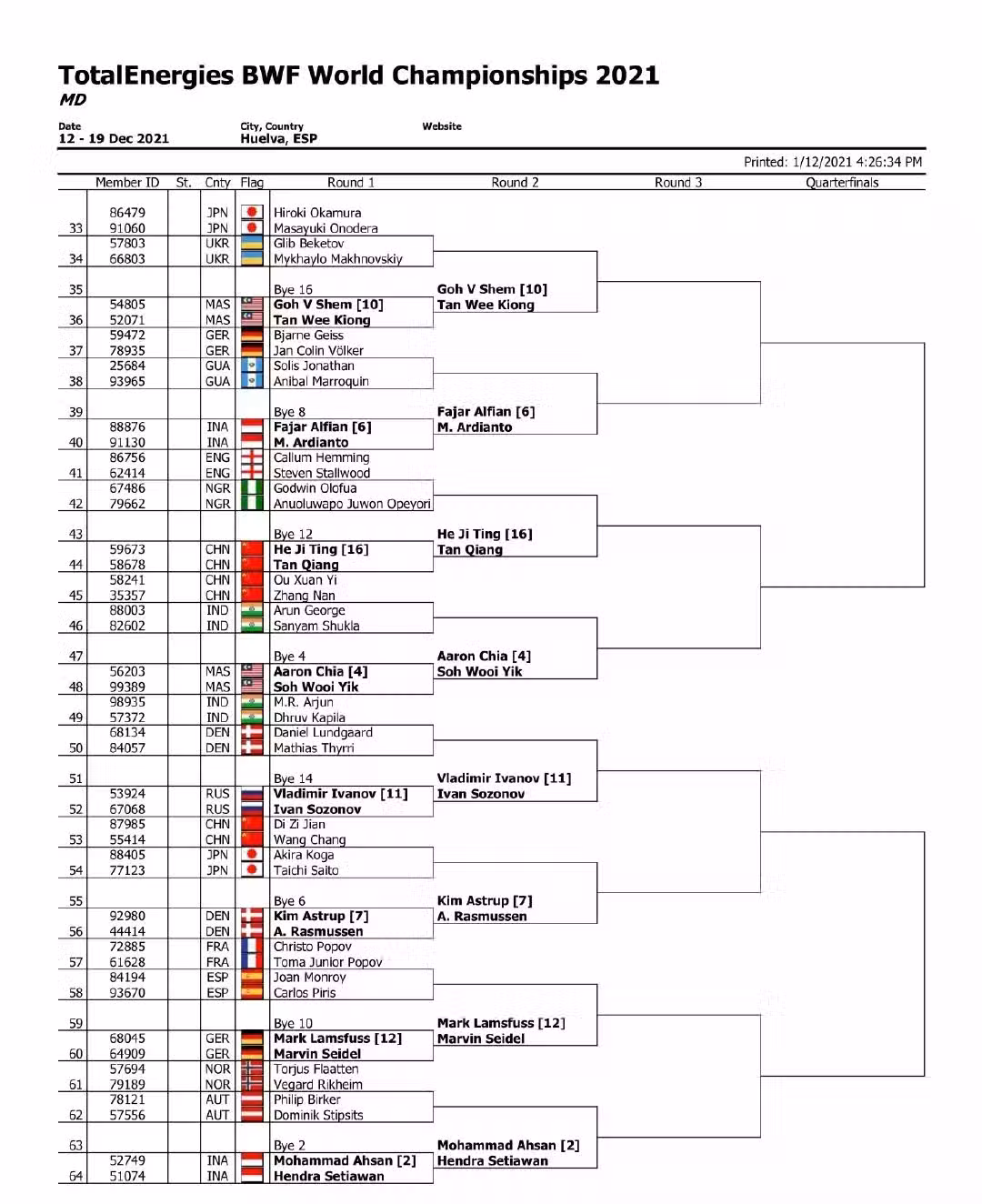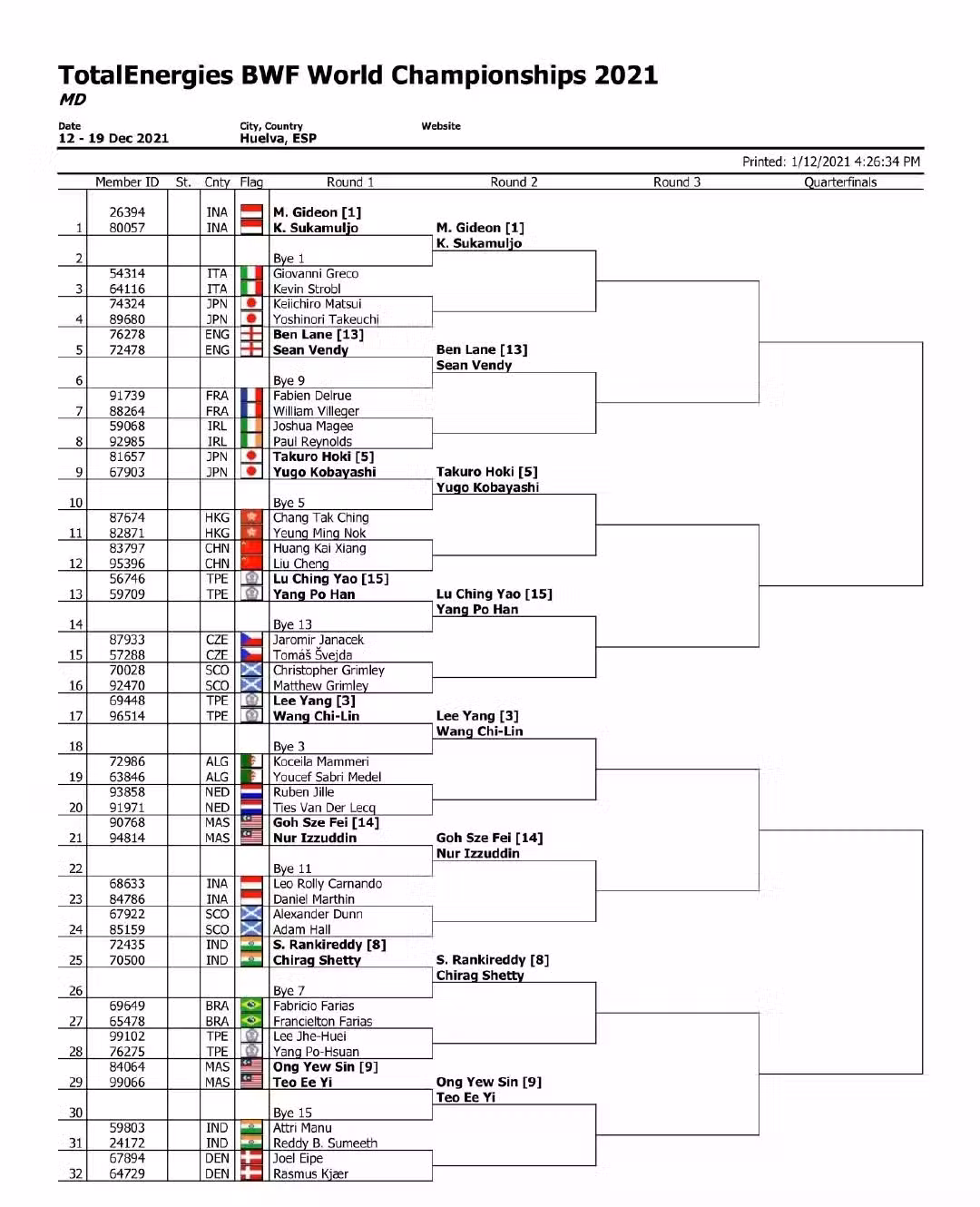 12月1日,2021年世錦賽抽籤結果出爐!中國男單諶龍、石宇奇沒有參賽,陸光祖首輪對戰昆拉武特,次輪將對戰周天成,簽運不佳!女單陳雨菲此前因傷退出世錦賽,據中國單打主教練夏煊澤透露,近日在一次訓練中,陳雨菲的右腳腳踝意外扭傷,因此無奈退出世錦賽。